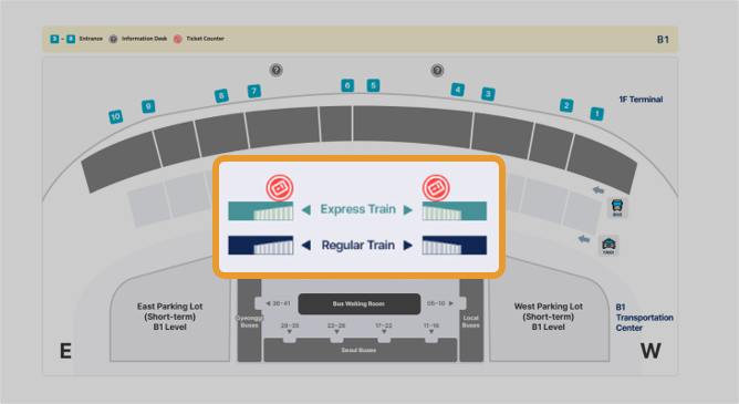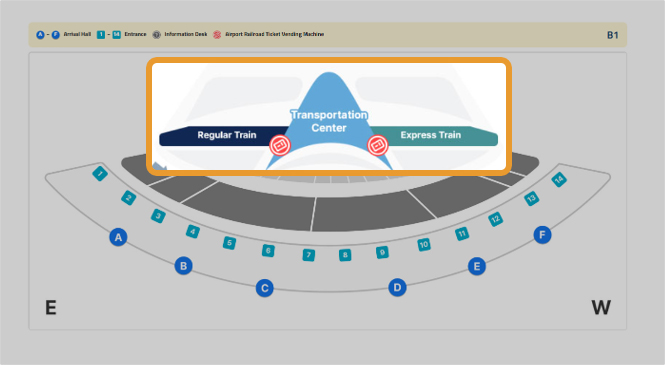 1. Take the Airport Railroad (AREX: Express Train or Regular Train) from Incheon International Airport at B1 floor.